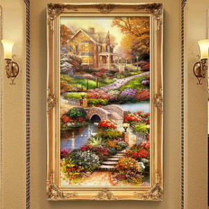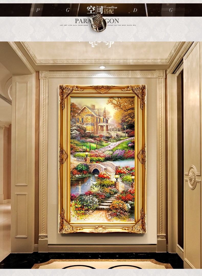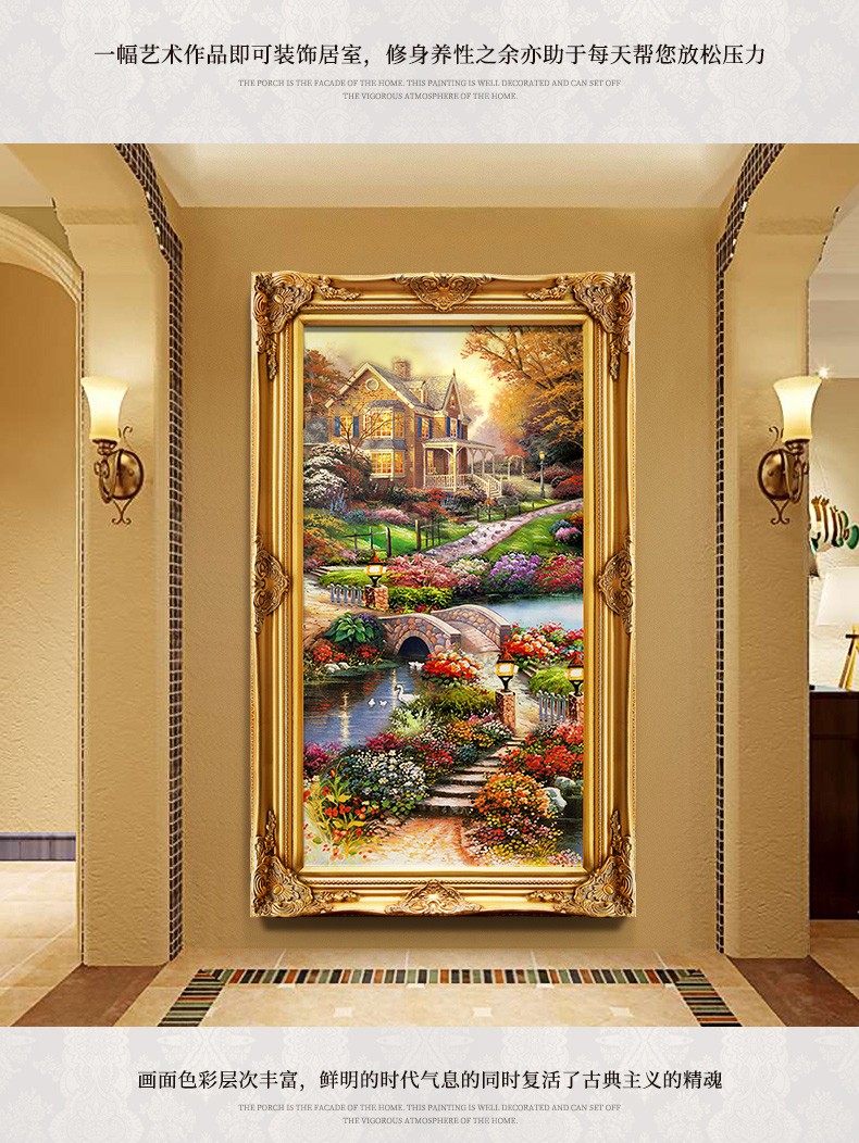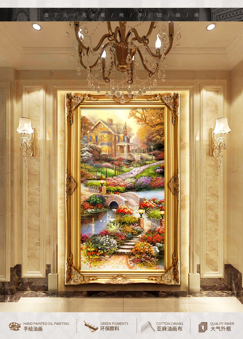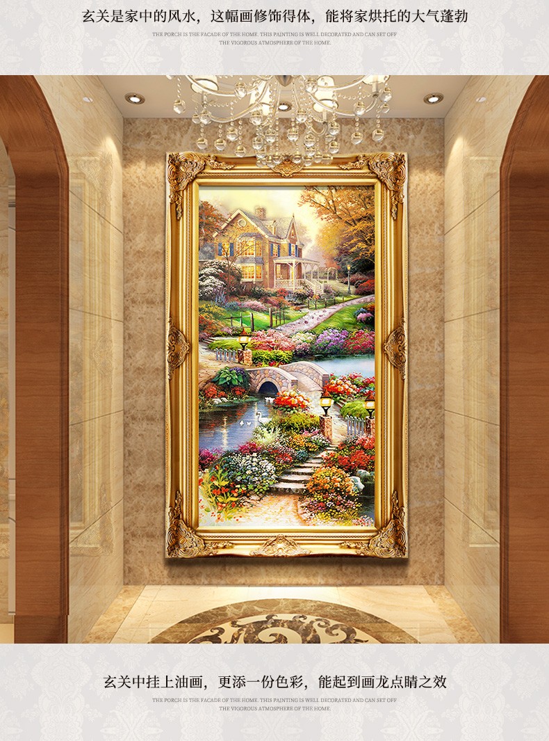 欧式玄关装饰画山水过道招财风水靠山宝盆山竖版美式挂画油画壁画